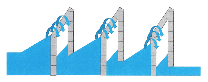 壁に当たるたびに勢いが弱くなり、波の体積はブロック間に一時おさまる。